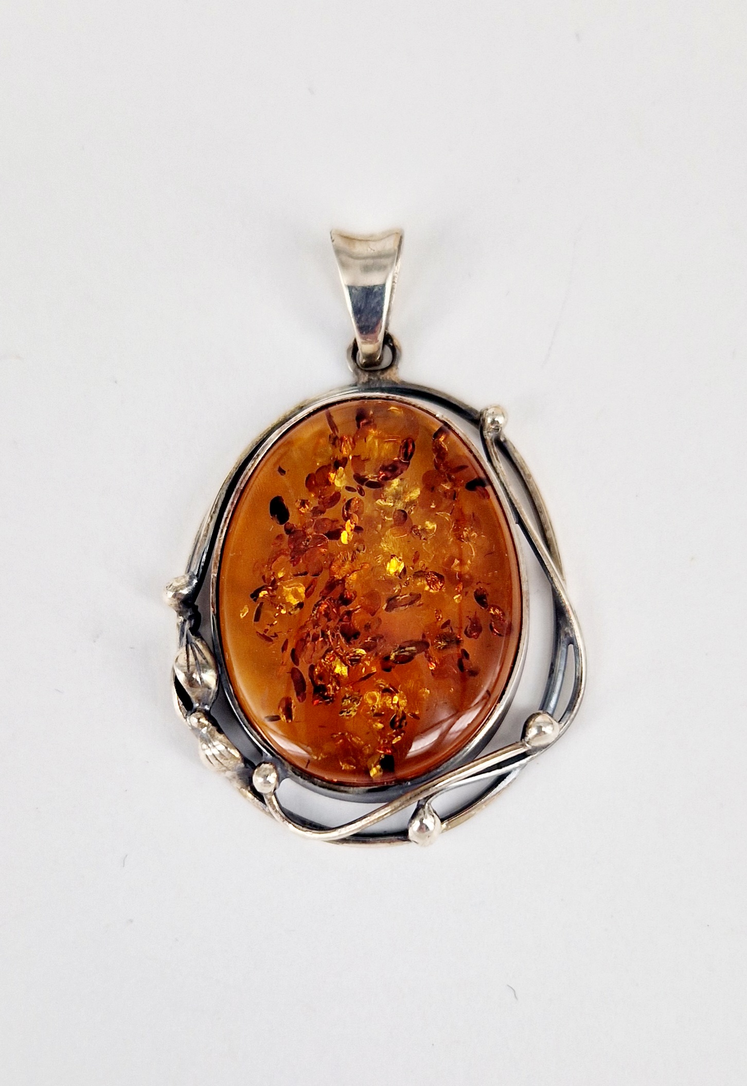 Großer Bernstein in dunkler Cognacfarbe mit Sonnenflinten (Bläschen) in traditioneller Sterling-Silberfassung