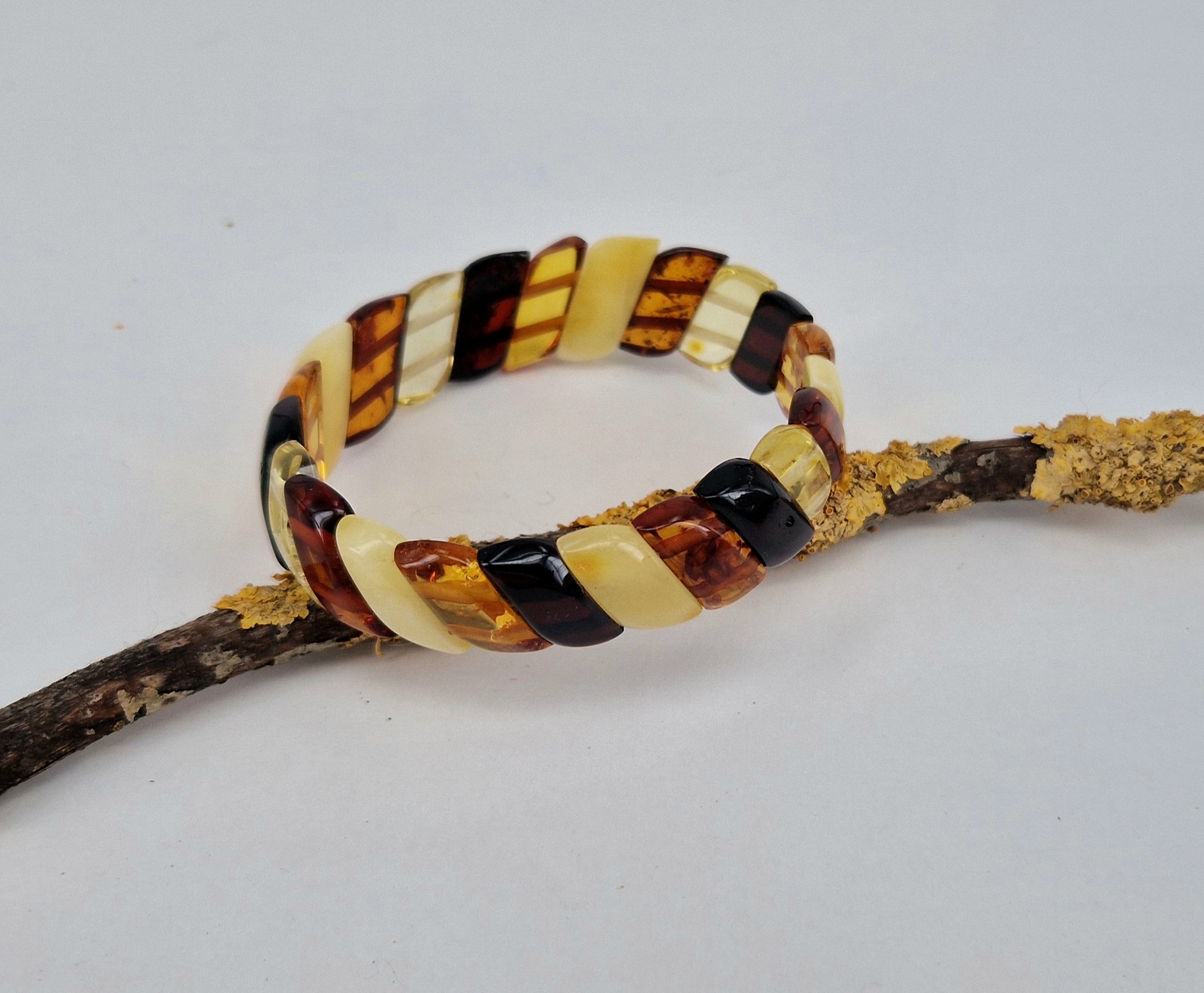 Naturbernstein Zugarmband, schräg geschliffene Stäbchen in allen Bernsteinfarben funkelnden Cognac, Orange und Zitrone wurden in Plättchen geschnitten und farbig koordiniert ,Plättchengröße ca 1x0,5 cm Umfang ca 20 cm