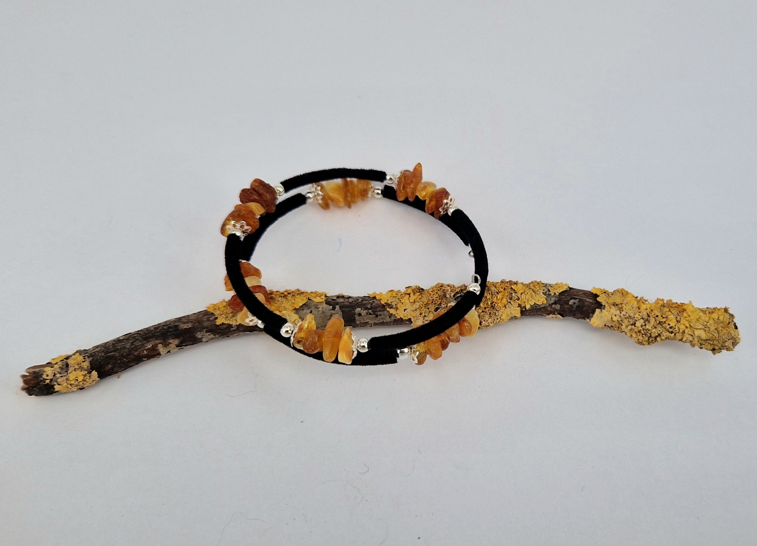 Aufgezogen an einem Edelstahldraht wechseln sich Bernsteine mit Samtstäbchen ab. Sehr gut geeignet ist dieses flotte Armband auch für Teenies
