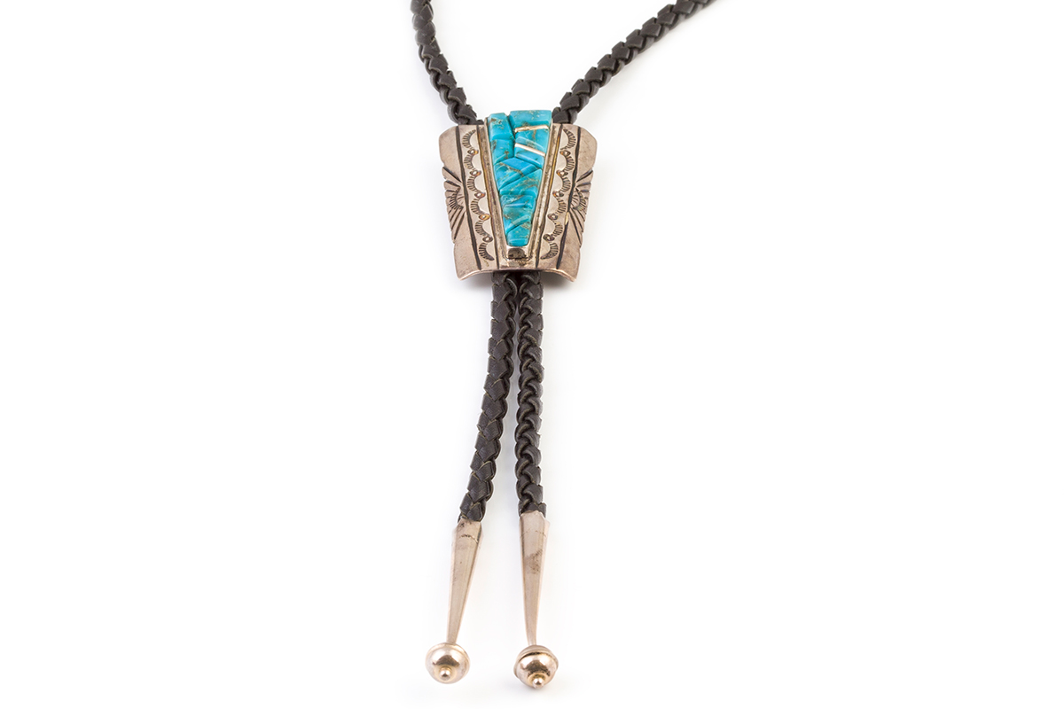 oder Western Krawatte ist im amerikanischen Westen sehr beliebt. Offizieller Halsschmuck in Arizona und New Mexico wird er auch z.B.in Neu Mexiko von den Kongressabgeordenten im Parlament in Santa Fe getragen. Die Verzierungen an der Brosche sind meistens sehr aufwending unter Verwendung von verschiedenen Edelsteinen, wie Türkis,Lapislazuli, Koralle und auch Bernstein. Wenn Damen sie tragen werden sie BOLA TIE genannt. Lederband mit Silbersptitzen. Rückseitig zur Längenverstellung eine Klappenmechanik