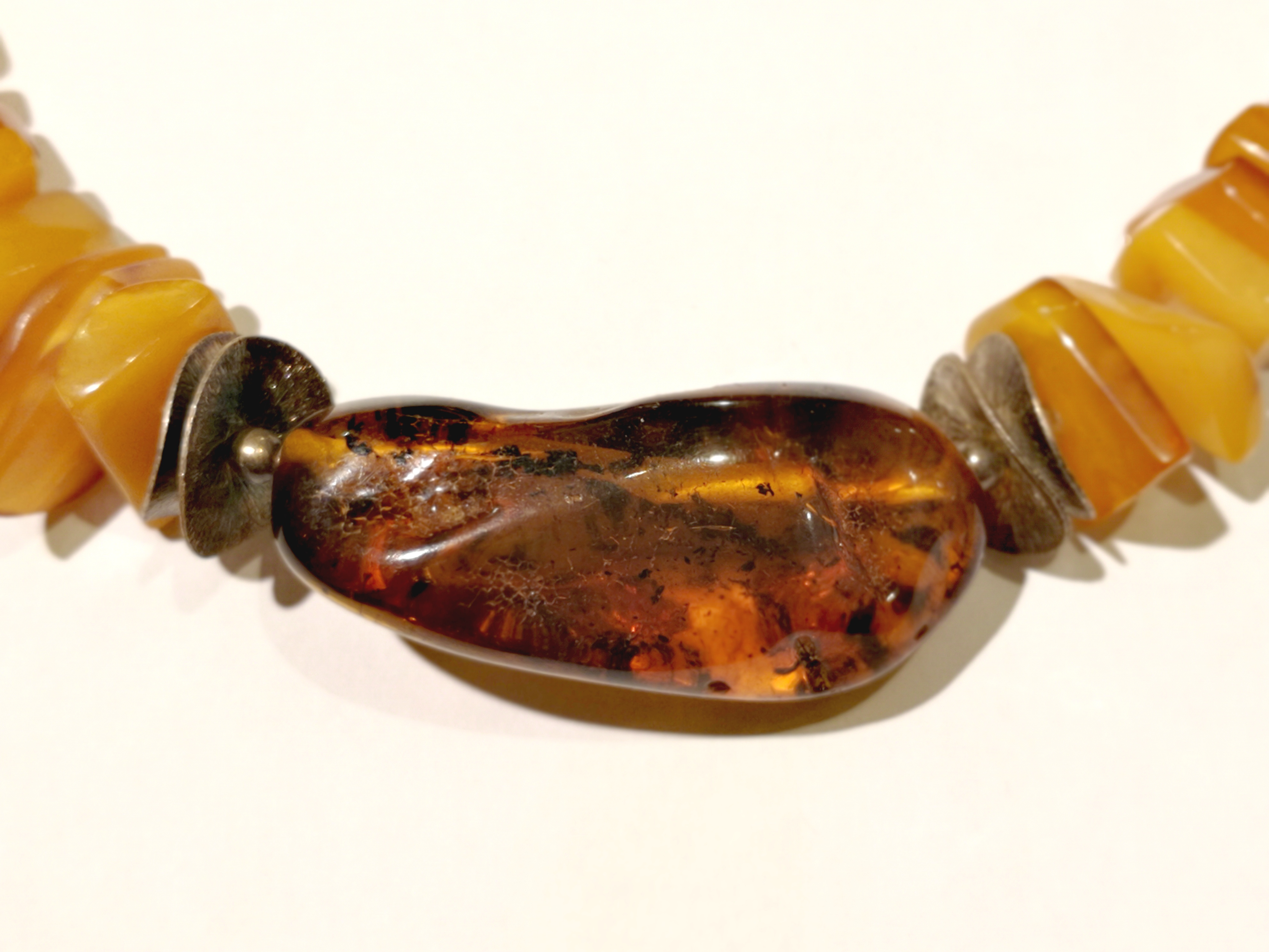 Großer Bernstein mit raren Einschlüssen von Erde, Moos, Rinde und Waldstaub aus dem Urwald vor 40 Mio Jahren eingebettet in eine wunderschöne Kette aus großen Antikbernstein-Nuggets. Zwischenteile und Verschluß aus Sterling-Silber.