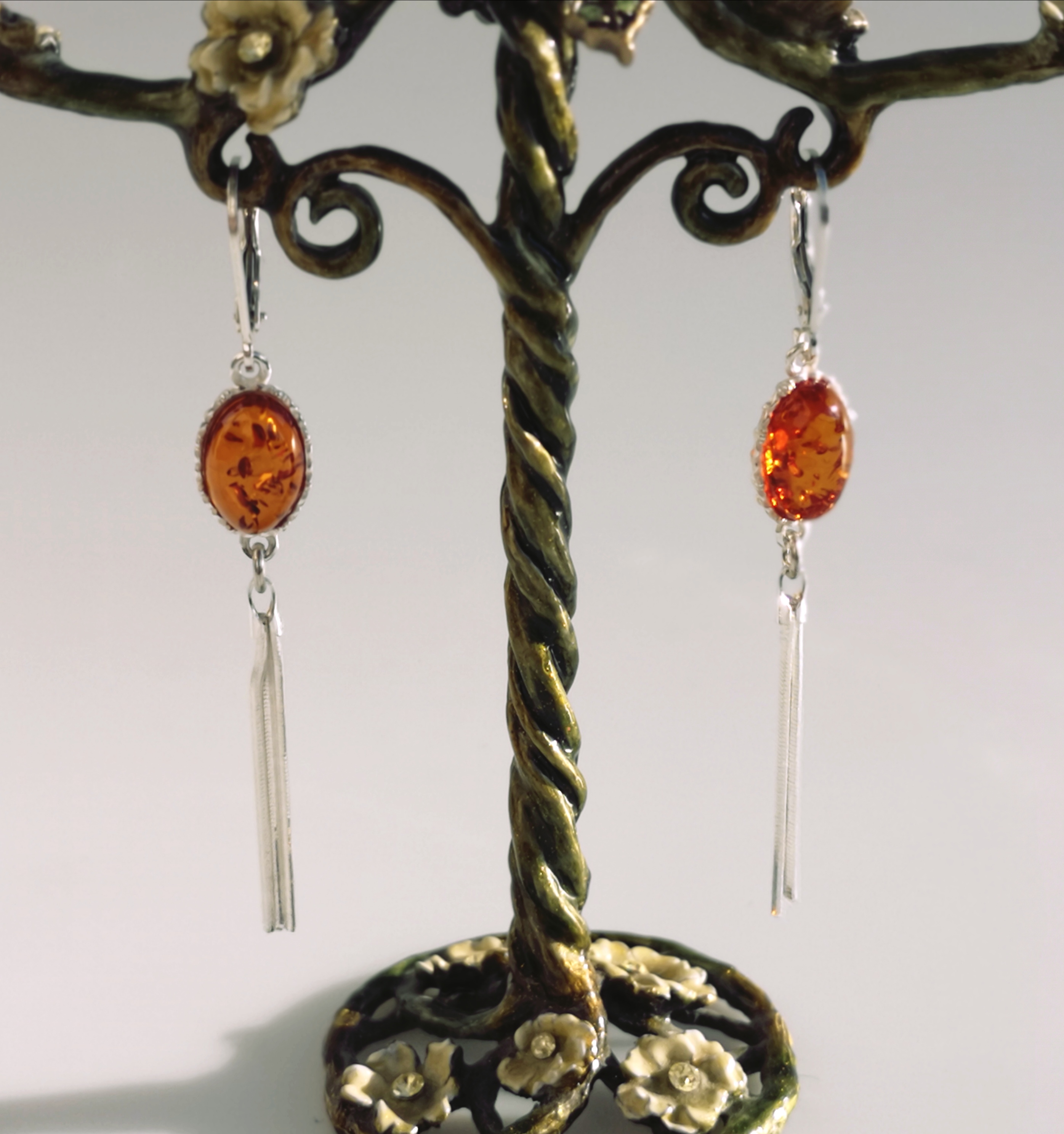 Äußerst attraktiver Ohrhänger mit Klappbügel, Leuchtender, cognacfariger Bernstein und feinen Fäden aus Sterling-Silber im Stil der 20ziger Jahre
